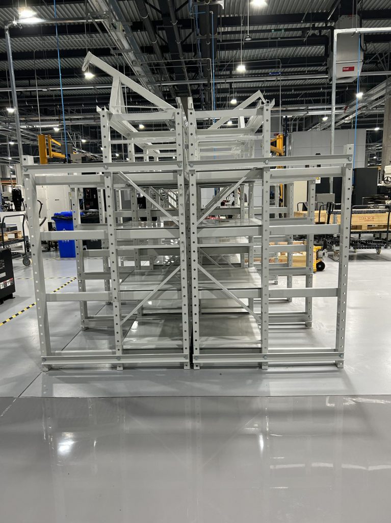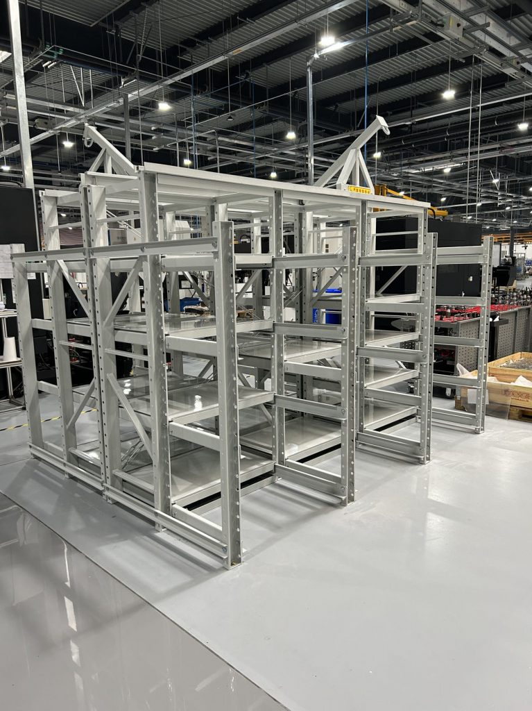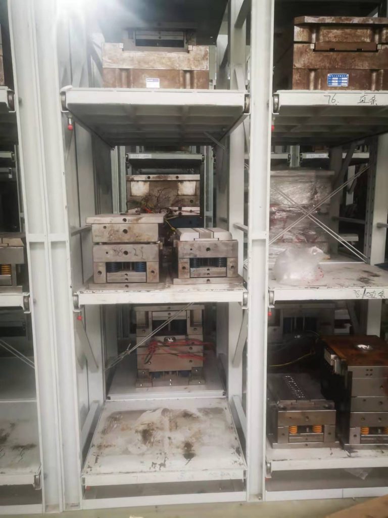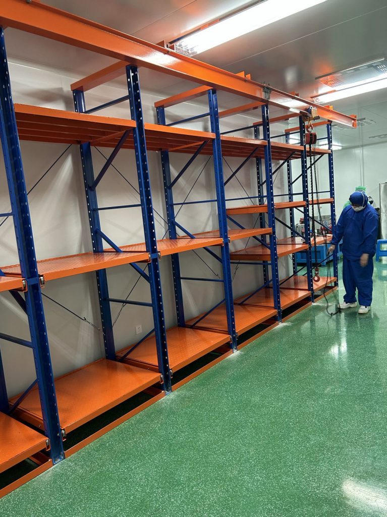無塵生產(chǎn)車間采用的是常規(guī)模具存放方式,模具不接觸托盤,模具更換保養(yǎng)后直接配合工字鋼天車存放在模具架上;