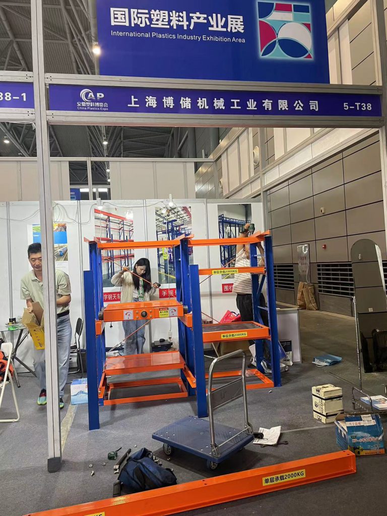 外圍車間選擇底部鏤空式博儲全抽模具架帶工字鋼天車,配手拉葫蘆,底部放置托盤,通過手動搬運車存放模具,中間層使用手拉葫蘆配合模具架完成存放;