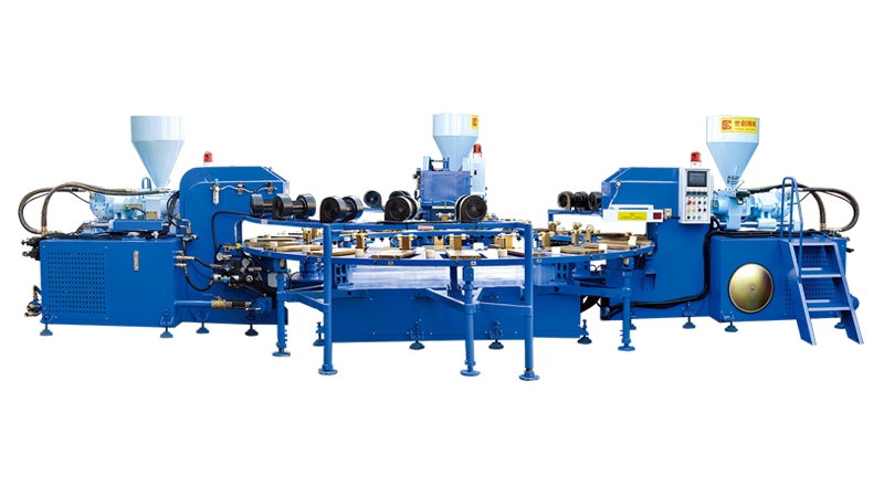 SC-724-3全自動(dòng)回轉(zhuǎn)式 三頭三色/TPR/PVC鞋底注射成型機(jī)1.該機(jī)臺可生產(chǎn)雙色、三色TPR/PVC底片及鞋底。