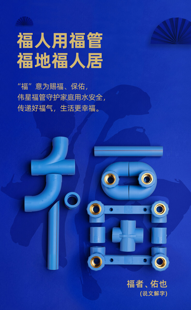 偉星福管是偉星F-PPR管系列的定制產品,偉星注冊“福管”商標,管件精心刻印“?!弊?,將福送入千家萬戶,匯聚祥瑞、吉祥美好。